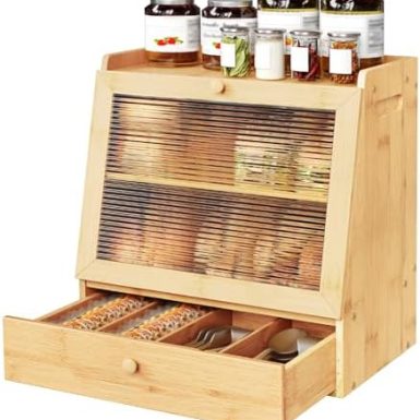 HOOBRO Bread Box, Bamboo Bread Box Storage Container with Drawer, 2-Tier Kitchen Countertop Food Storage Box with Acrylic Door, for Food, Natural YL21MB01